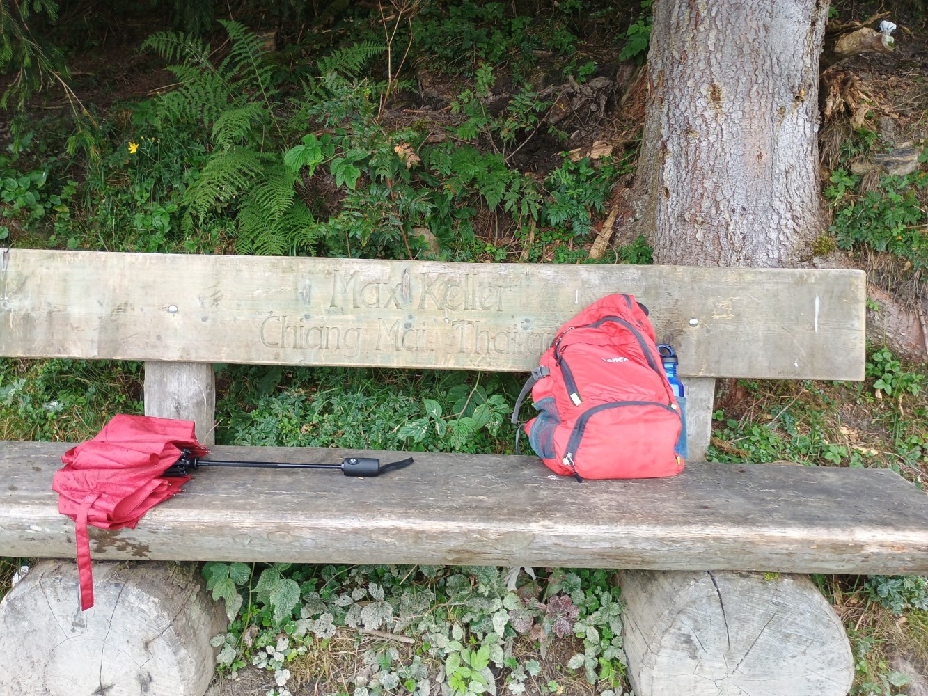 A lull in the rain - my umbrella and backpack on a random bench in the middle of no-where.