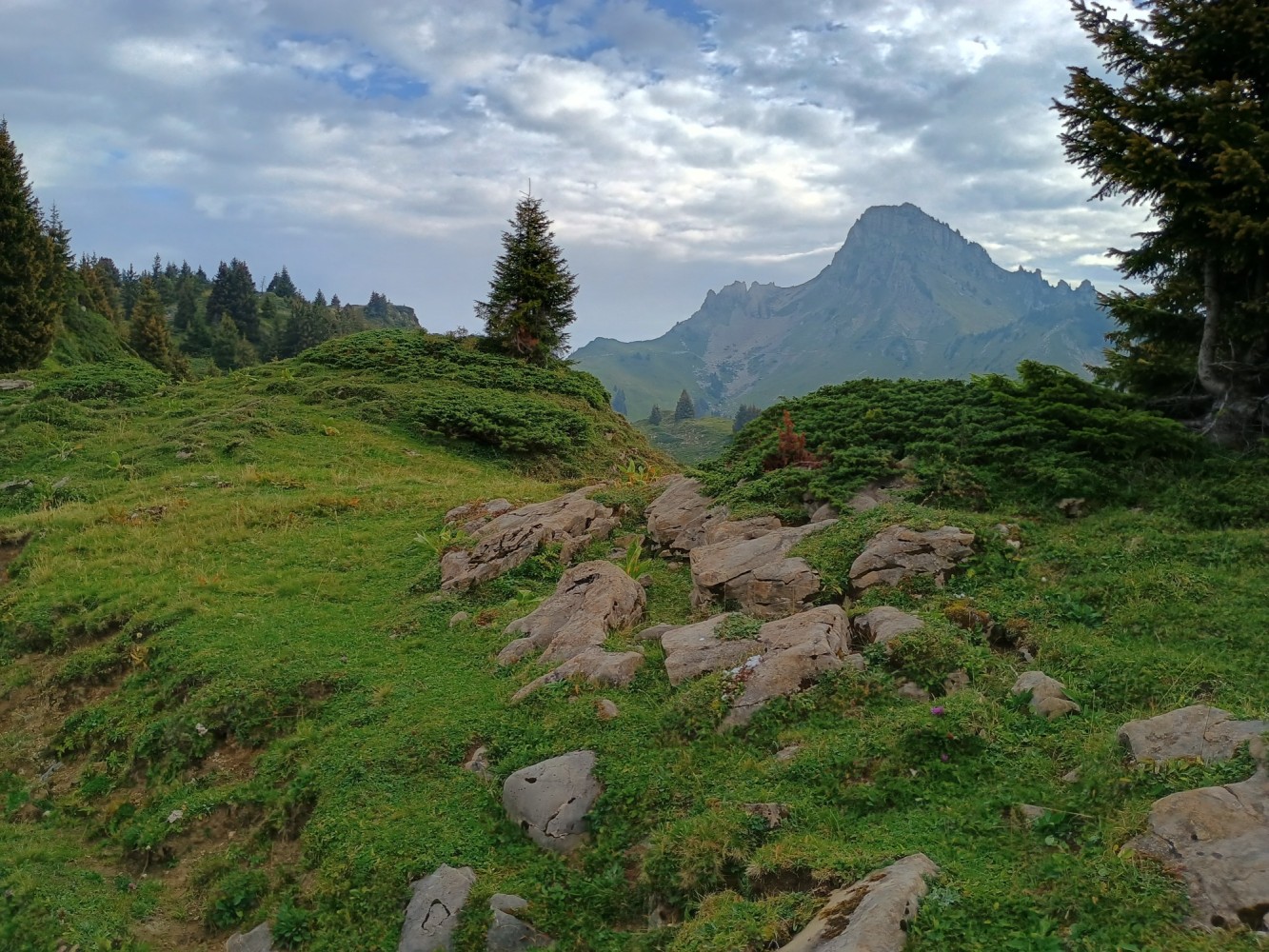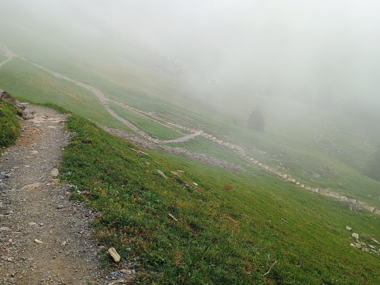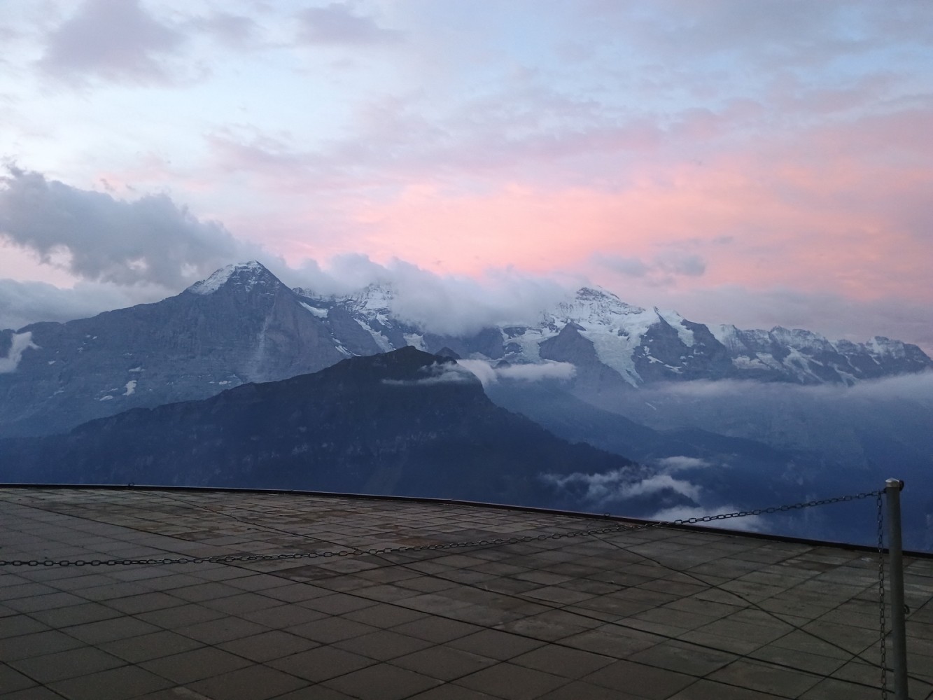 I woke up this morning to a beautiful sunrise over the Eiger, Mönch, and Jungfrau. It was still fairly clear first thing in the morning. I went down and had a really nice breakfast, packed up, and headed out on a circular hike that took me out to the "point of no return" for a hike to First. As I approached the far end of the hike the clouds came in and it became foggy with limited visibility. After the hike I took the cog-wheel train back down the mountain and returned to Brig.