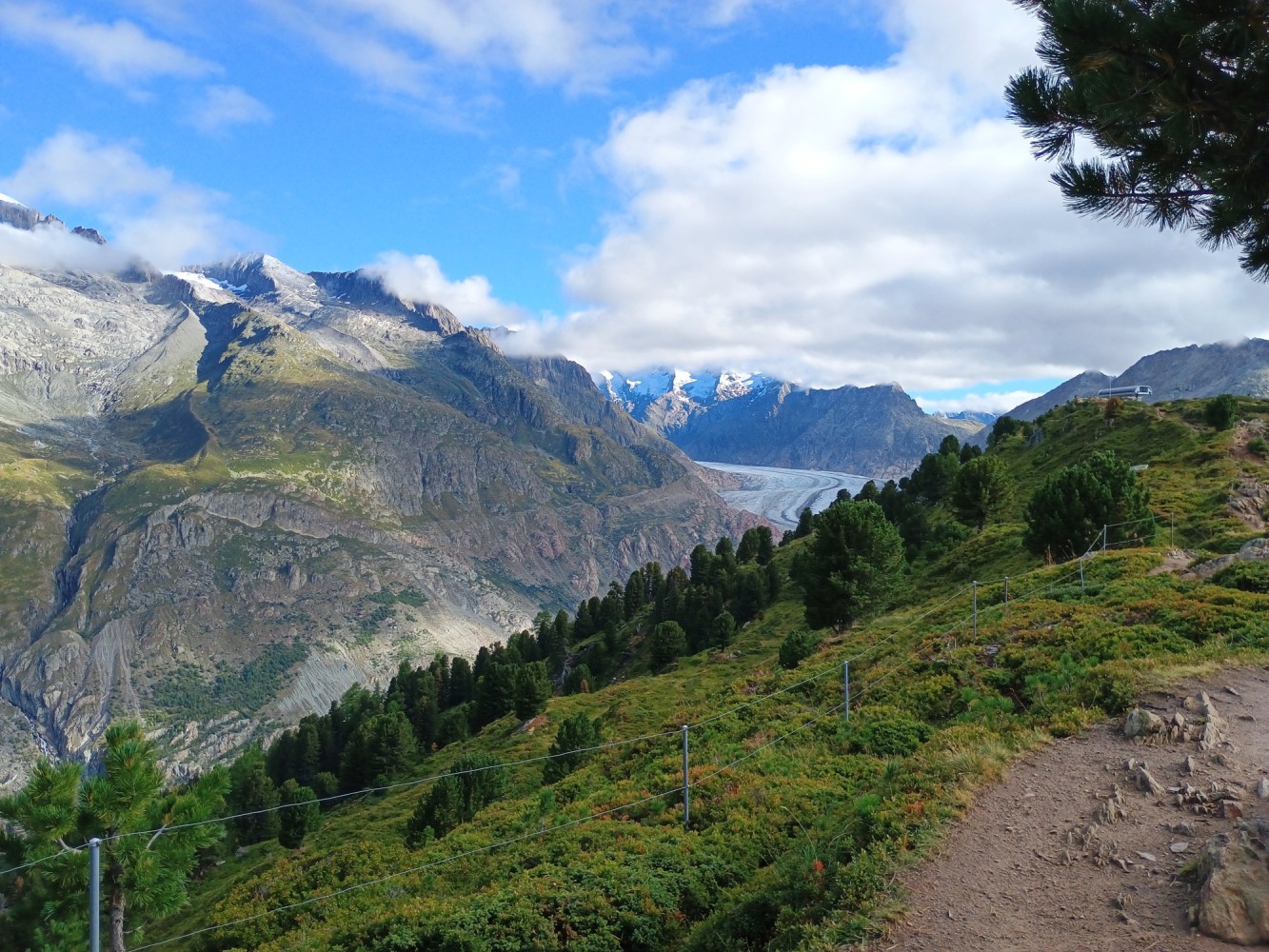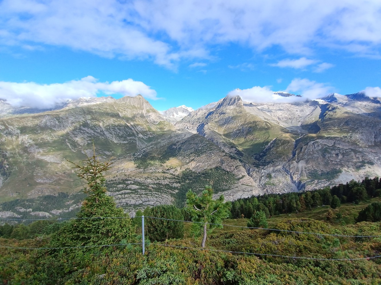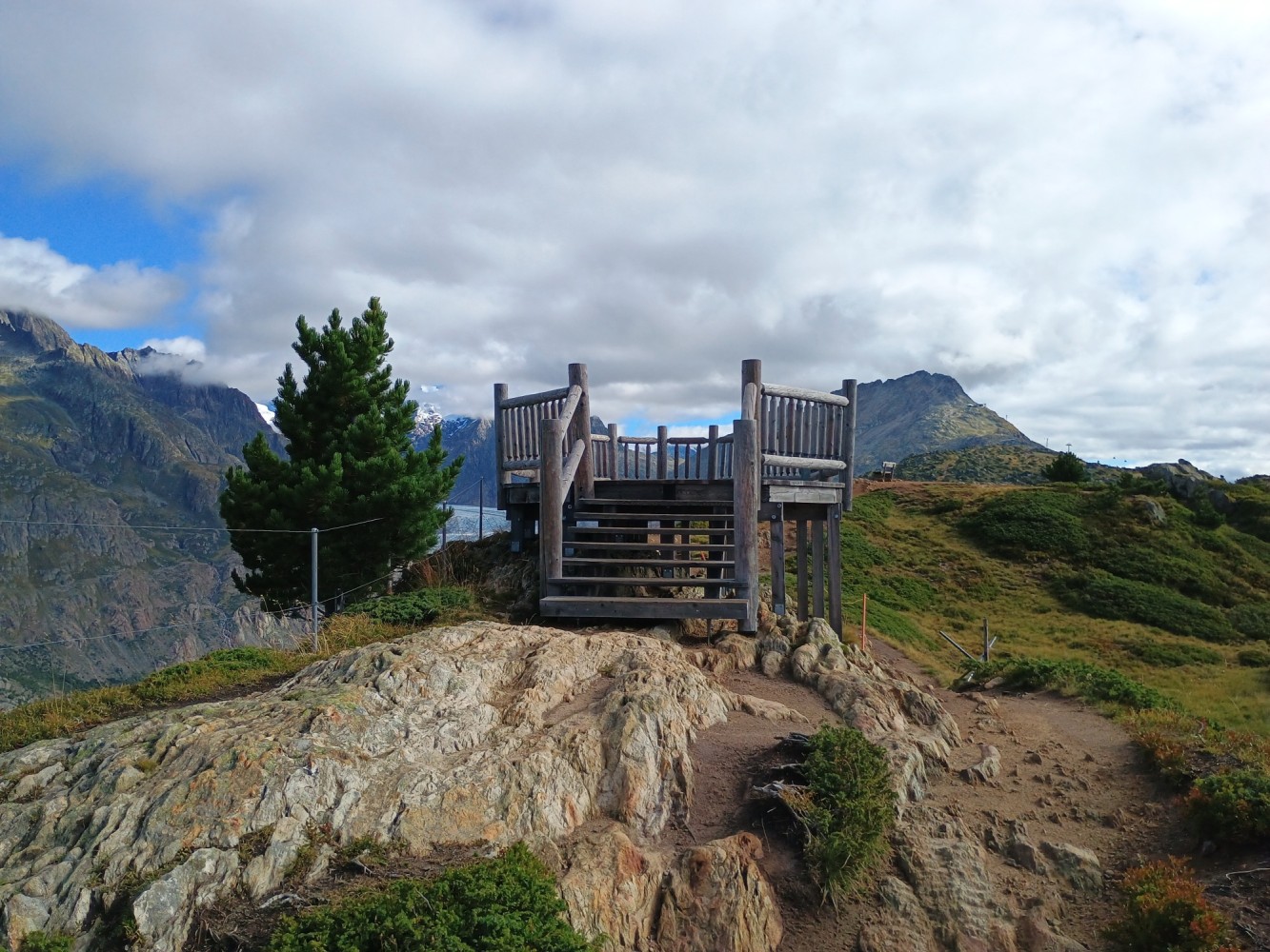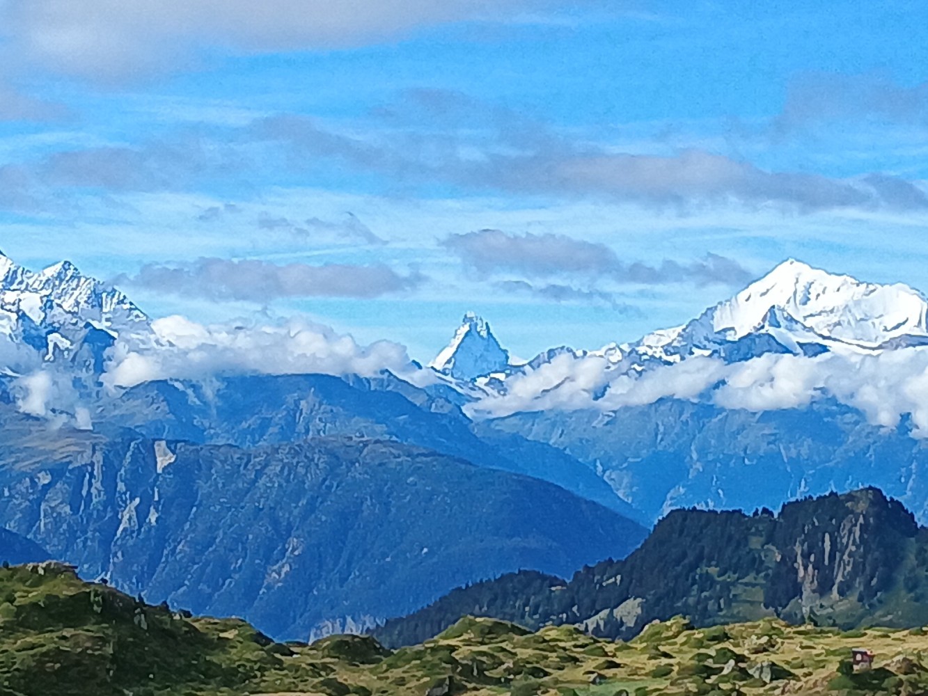 Changed plan! It was finally beautiful weather so I decided to do a hike with a view. Still a bit tired from yesterday's hike in the rain, I did this one with quite a bit of elevation gain. While still cloudy, there were breakthrough moments with spectacular long range views of the southern alps including the Matterhorn. This hike ends at the starting point of the Aletschglacier hike I did with Alex and Claudia in 2021.