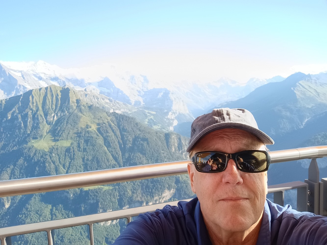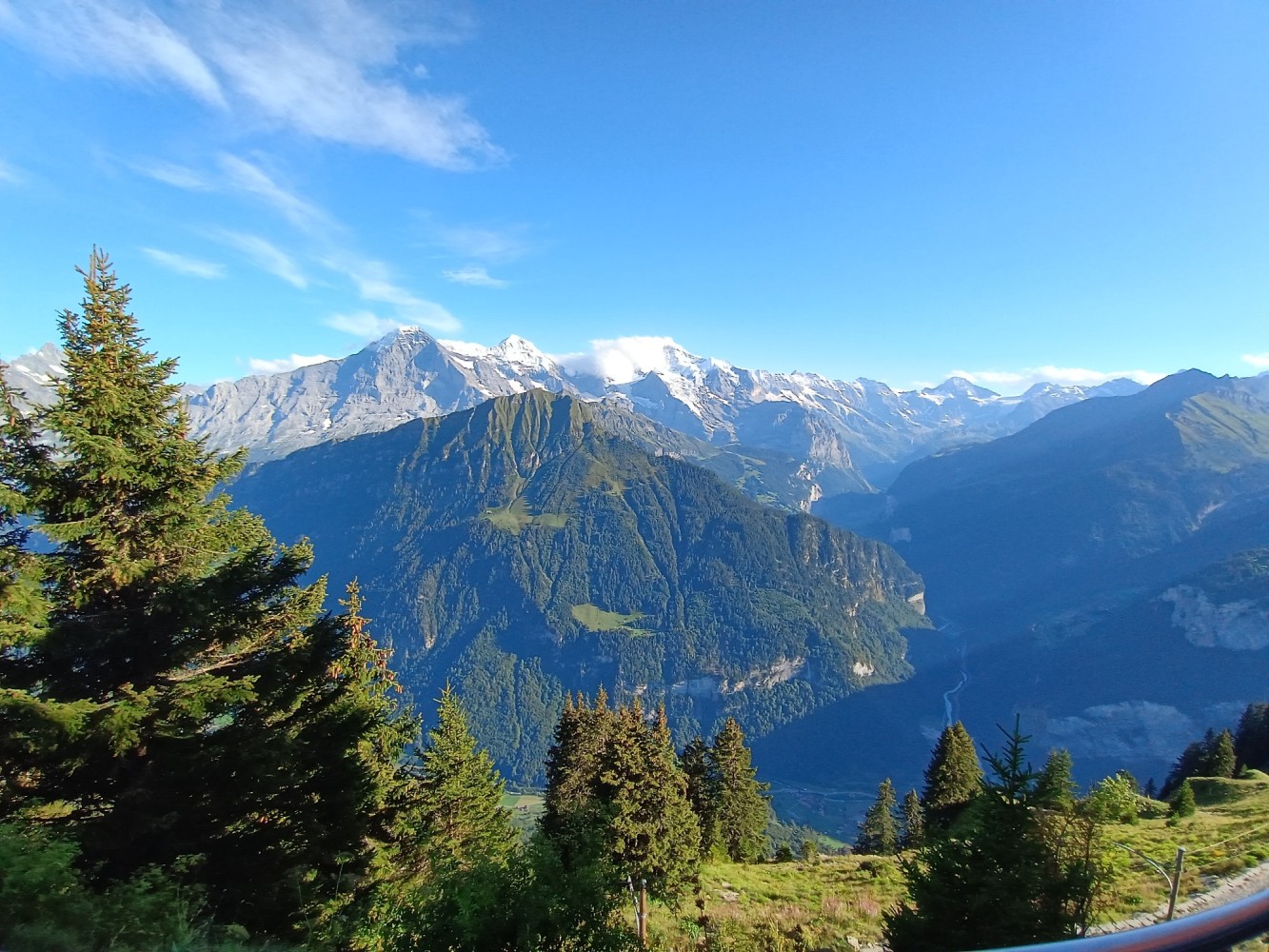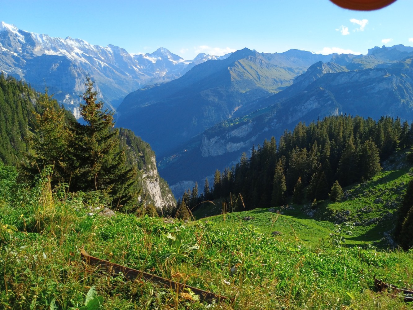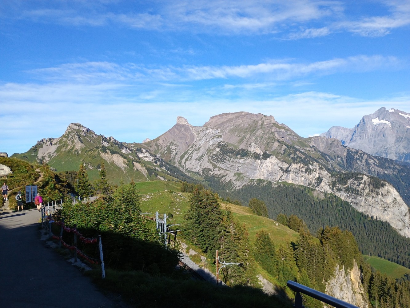 Today I took a train from Brig to Montreux and rode the beautiful "Golden Pass Express" train from Montreux to Interlaken. I had a small lunch on the train during the ride with a glass of Swiss white wine. From Interlaken I continued my journey to Schynige Platte on a cog-wheel train for an overnight stay at the Schynige Platte Hotel. The only access to the hotel is via the cog-wheel or hiking. A 4-course dinner is included in the stay.