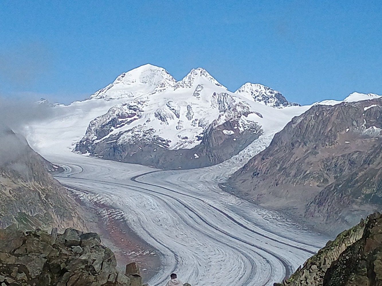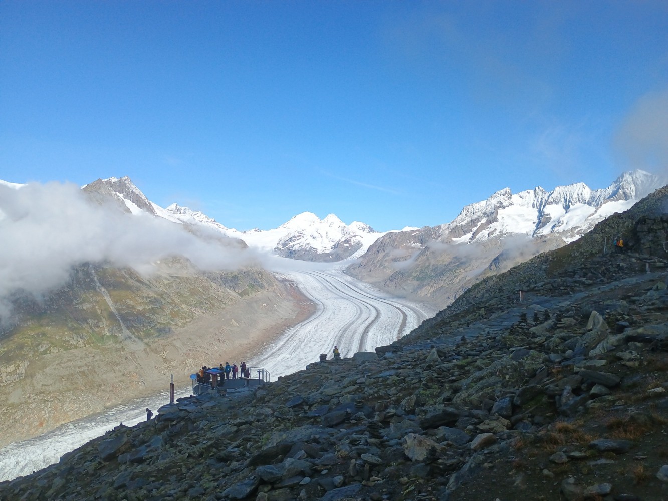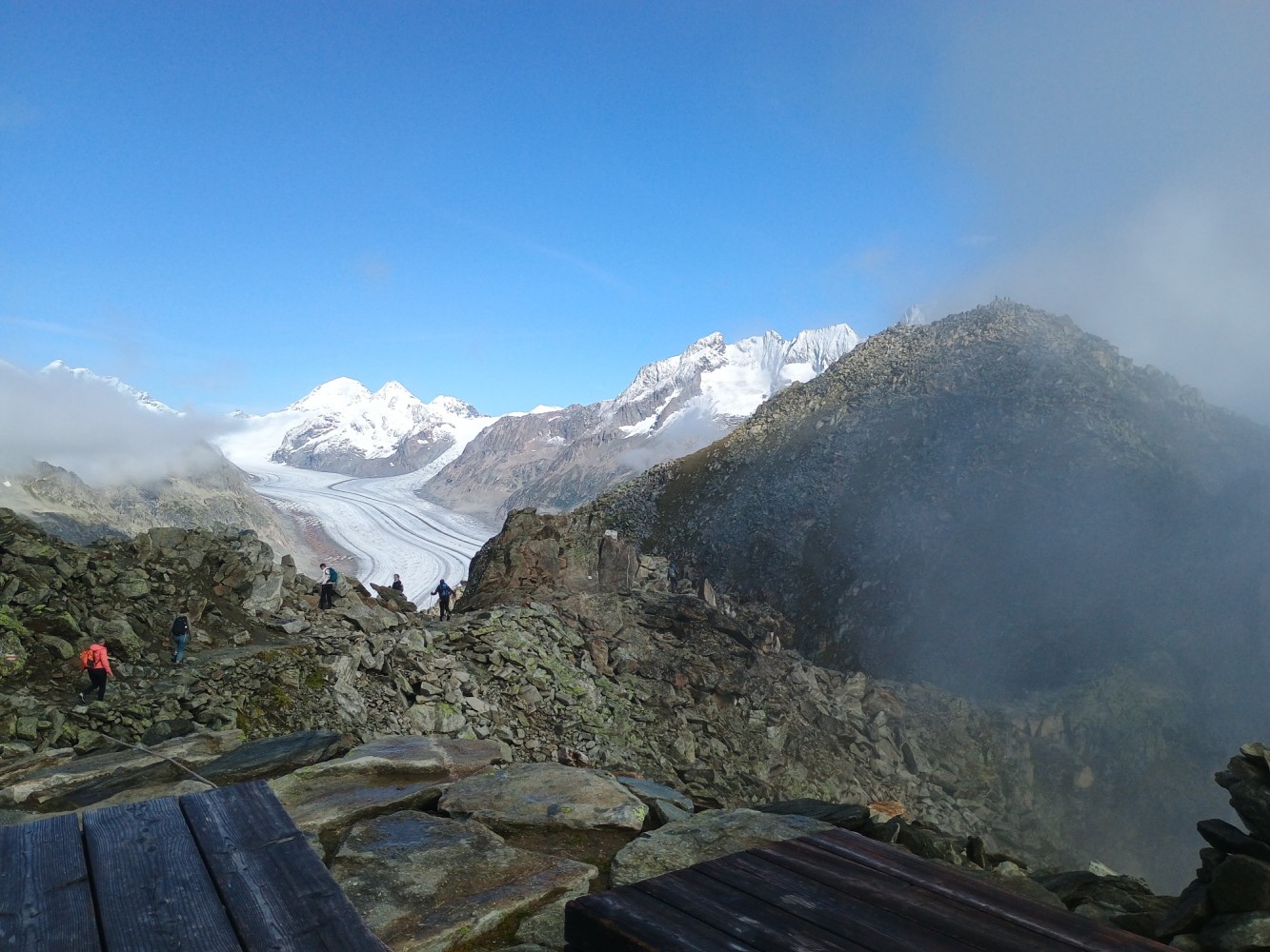 The weather was not cooperating today and I'm still pretty tired from yesterday's hike. Instead, I took the train up to Fiesch and the cablecars up to the Eggishorn. It was foggy all the way up and then cleared just at the top. I then went down to Fiescheralp station for lunch. Had a delicious fruit torte.